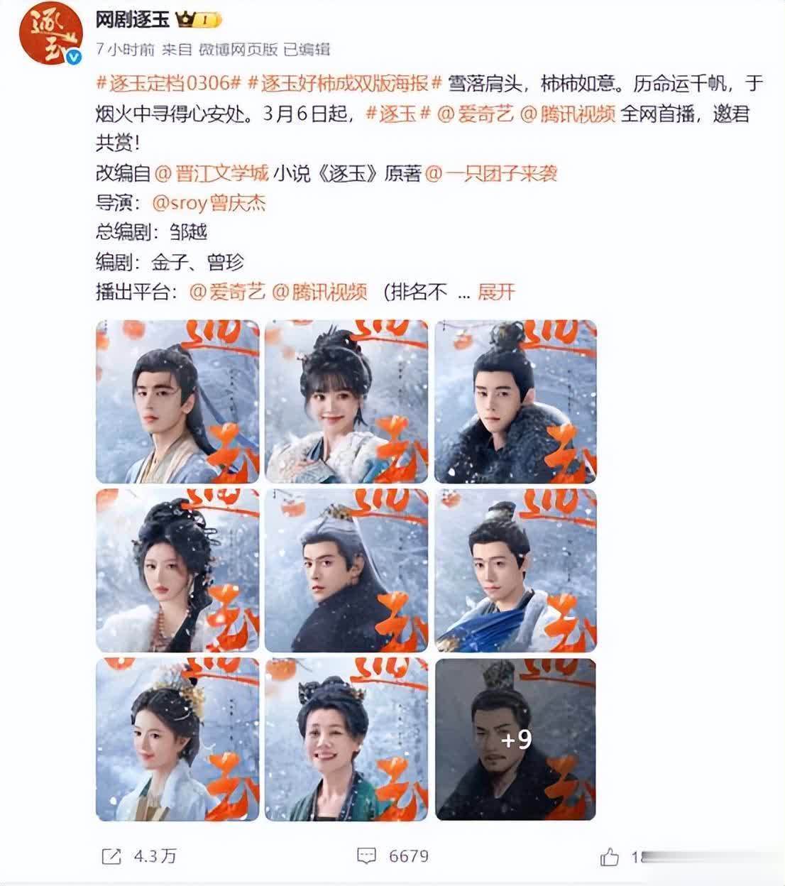《逐玉》官宣定档,将于3月6日在鹅厂、桃厂上线。